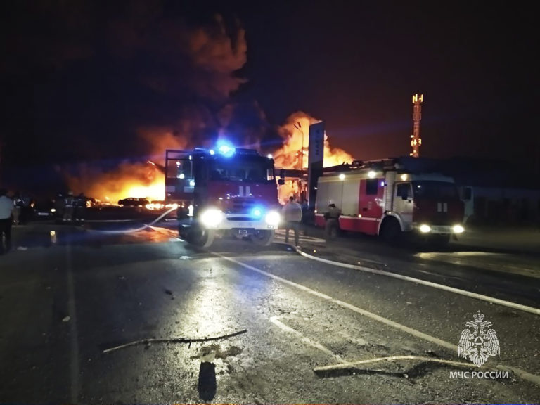 Pri výbuchu na čerpacej stanici v Dagestane na juhu Ruska zahynulo 30 ľudí a desiatky ďalších utrpeli zranenia. Incident sa na predmestí regionálneho hlavného mesta Machačkala. Požiar vypukol v autoservise a rozšíril sa na neďalekú čerpaciu stanicu, čo vyvolalo výbuch. Foto: Ministry of Emergency Situations press service via AP.