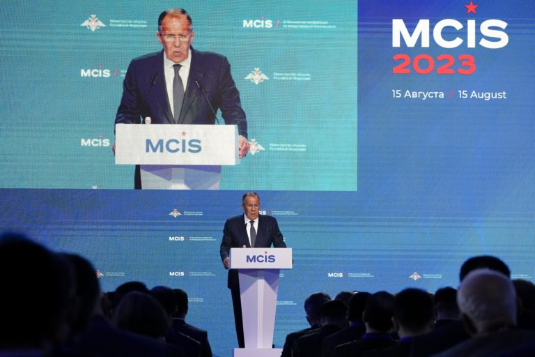 Prejav ruského ministra zahraničných vecí Sergeja Lavrova na vojenskom fóre. Foto: SITA/AP.