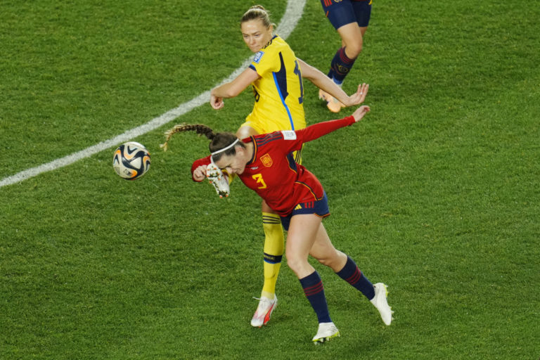 Švédska reprezentantka Fridolina Rolfová v súboji so Španielkou Teresou Abelleirovo počas semifinálového zápasu na MS žien vo futbale. Foto: SITA/AP.