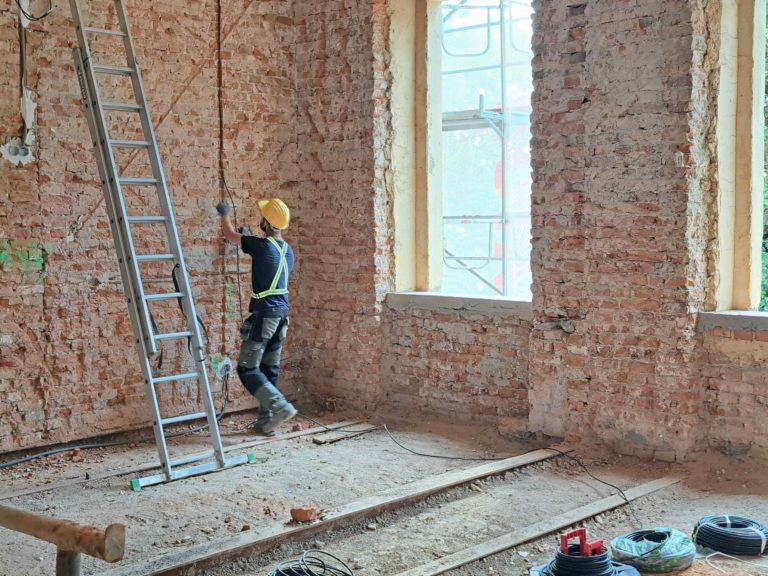 Práce na stavbe počas kontrolného dňa k prebiehajúcej investičnej akcii Prešovského samosprávneho kraja (PSK) s názvom Prestavba budovy Gymnázia Pavla Országha Hviezdoslava s prístavbou budovy Školy umeleckého priemyslu (ŠUP) v Kežmarku. Kežmarok, 15. august 2024. Foto: SITA/Mária Frisová