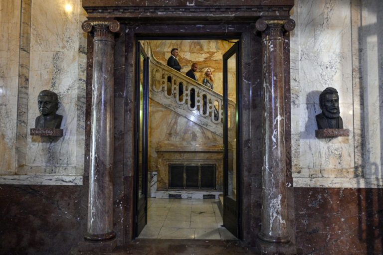Argentínsky pestovateľ na ikonickom námestí Plaza de Mayo nesie nazbierané listy, z ktorých sa vyrába nápoj yerba maté, na protest proti návrhu prezidenta Javiera Mileia zrušiť cenové kontroly a dotácie ovplyvňujúce celý rad trhov, vrátane yerba maté. Buenos Aires, 15. august 2024. Foto: SITA/AP