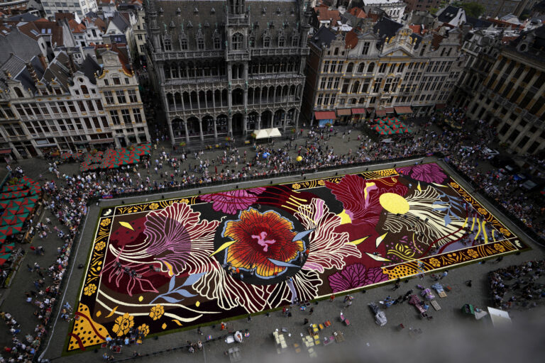 Dobrovoľníci na námestí Grand Place pracujú na obrovskom kvetinovom koberci z begónií vypestovaných v Belgicku. Brusel, 15. august 2024. Foto: SITA/AP