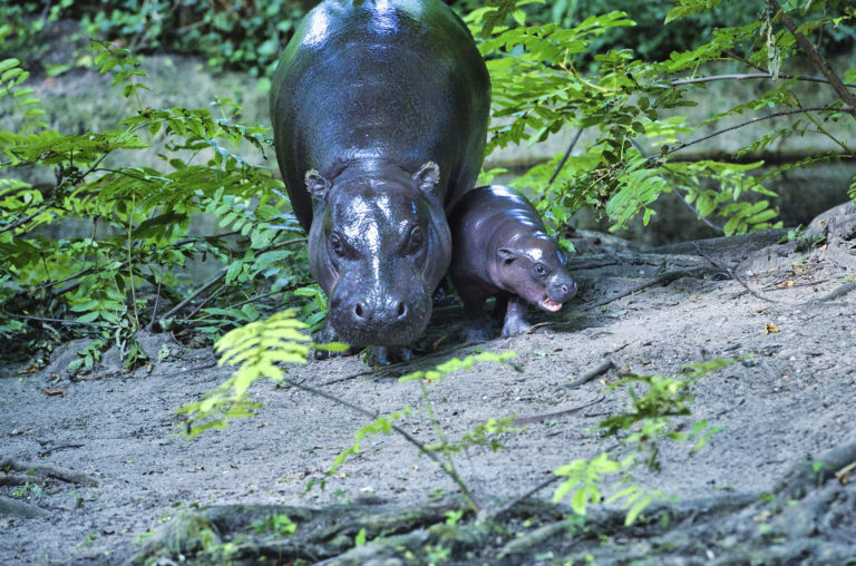 Hrošie mláďa Toni, ktoré sa narodilo v berlínskej zoo v júni, sa prvýkrát ukázalo verejnosti spolu so svojou matkou Debbie. Berlín, 15. august 2024. Foto: Paul Zinken/dpa via AP
