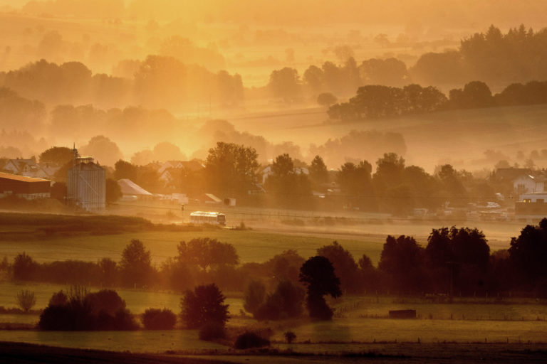 Vlak prechádza krajinou pri nemeckom Frankfurte počas východu slnka. Wehrheim, 15. august 2024. Foto: SITA/AP