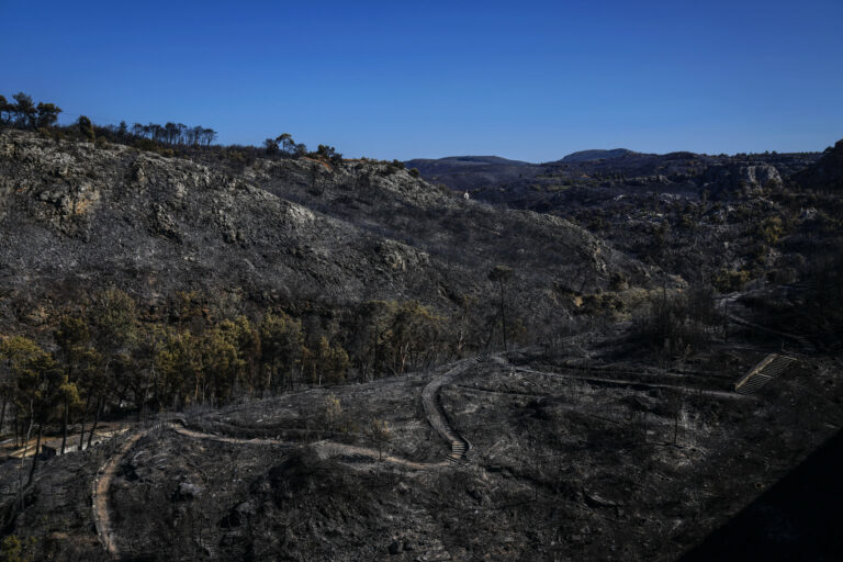 Pohľad na spálenú lesnú oblasť neďaleko mesta Marathón v Grécku po ničivom lesnom požiari. 15. august 2024. Foto: SITA/AP