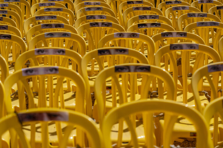 Obrazy ľudských očí sú umiestnené na prázdnych stoličkách zviazaných dohromady v umeleckej inštalácii zobrazujúcej rukojemníkov zadržiavaných Hamasom. Tel Aviv, 15. august 2024. Foto: SITA/AP