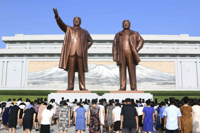Severokórejčania pred sochami zosnulých vodcov Kim Ir Sena a Kim Čong-ila počas osláv 79. výročia oslobodenia Kórey spod japonskej nadvlády. Pchongjang, 15. august 2024. Foto: SITA/AP