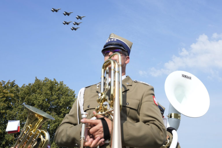 Vojenská kapela počas osláv Dňa ozbrojených síl Poľska. Varšava, 15. august 2024. Foto: SITA/AP