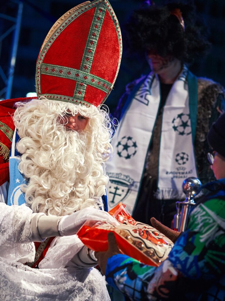 Belasý Mikuláš rozdáva darčeky deťom vo fanzóne v areáli štadiónu Tehelné pole pred začiatkom futbalového zápasu 18. kola základnej časti Niké ligy 2025/2026 medzi ŠK Slovan Bratislava - MŠK Žilina. Bratislava, 14. december 2025. Foto: SITA/ŠK Slovan Bratislava