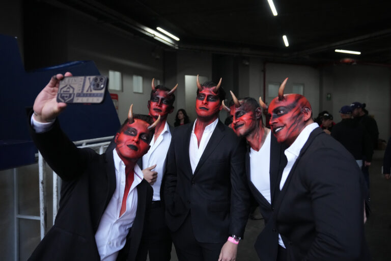 Muži oblečení ako diabli pózujú pre selfie pred odvetným finálovým zápasom mexickej futbalovej ligy medzi Tolucou a Tigres v Toluce. Mexiko, 14. decembra 2025. Foto: AP Photo/Eduardo Verdugo