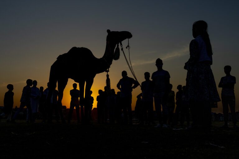 Kašmírčania sa zhromažďujú okolo ťavy vystavenej pre zákazníkov na trhu s dobytkom, ktorý bol zriadený pri príležitosti nadchádzajúceho moslimského sviatku Íd al-Adhá v Šrínagare v Indiou kontrolovanom Kašmíre v sobotu 15. júna 2024. Sviatok Íd al-Adhá, alebo "sviatok obetovania", sa zvyčajne vyznačuje spoločnými modlitbami, veľkými spoločenskými stretnutiami, porážaním dobytka a rozdávaním mäsa núdznym. Foto: SITA/AP