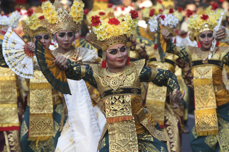 Tanečníci vystupujú počas sprievodu na otvorení festivalu umenia na Bali v Denpasare na Bali v Indonézii v sobotu 15. júna 2024. Na ostrove Bali sa v súčasnosti koná mesačný festival umenia, ktorý trvá od 15. júna do 13. júla. Foto: SITA/AP