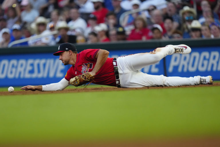 Prvý hráč Atlanty Braves Matt Olson nedosiahne na loptičku, ktorú odpálil Isaac Paredes z Tampy Bay Rays vo štvrtej zmene baseballového zápasu v piatok 14. júna 2024 v Atlante. Foto: SITA/AP