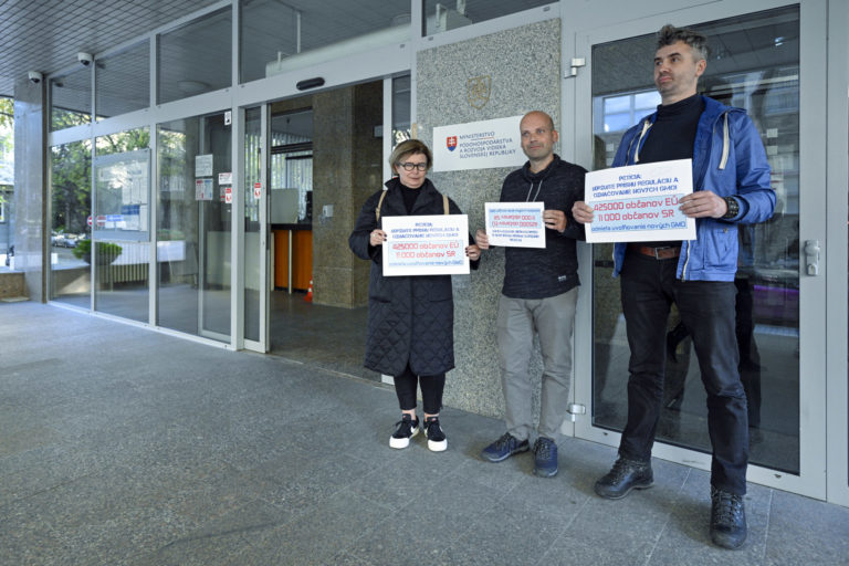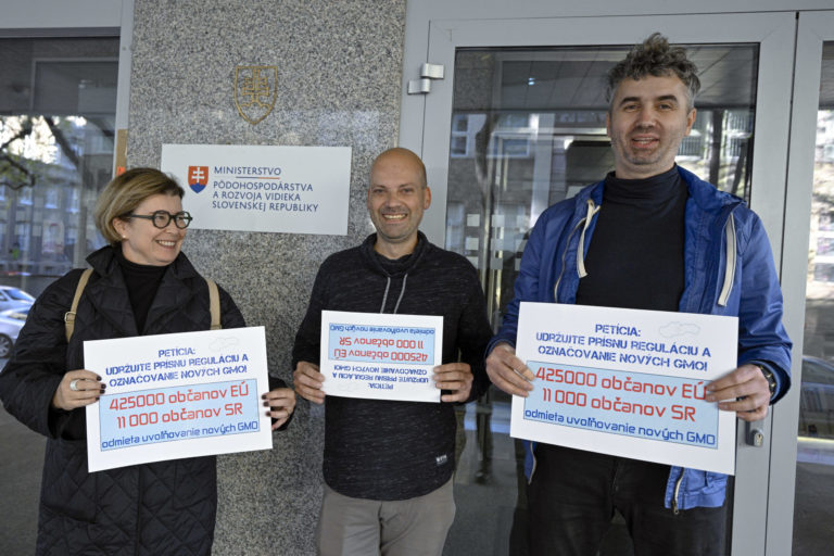 Zľava: Predsedkyňa správnej rady Slow Food Pressburg Petra Molnárová, člen predsedníctva zväzu Ekotrend Slovensko Miloš Homola a environmentalista Peter Sudovský počas prehlásenia o tom, že 425 000 občanov EÚ z toho 11 000 občanov SR odmieta uvoľnenie pravidiel pre nové GMO v rámci odovzdania petície s názvom „Udržujte prísnu reguláciu a označovanie nových GMO na Ministerstvo pôdohospodárstva a rozvoja vidieka SR. Bratislava, 15. november 2023. Foto: SITA/Milan Illík