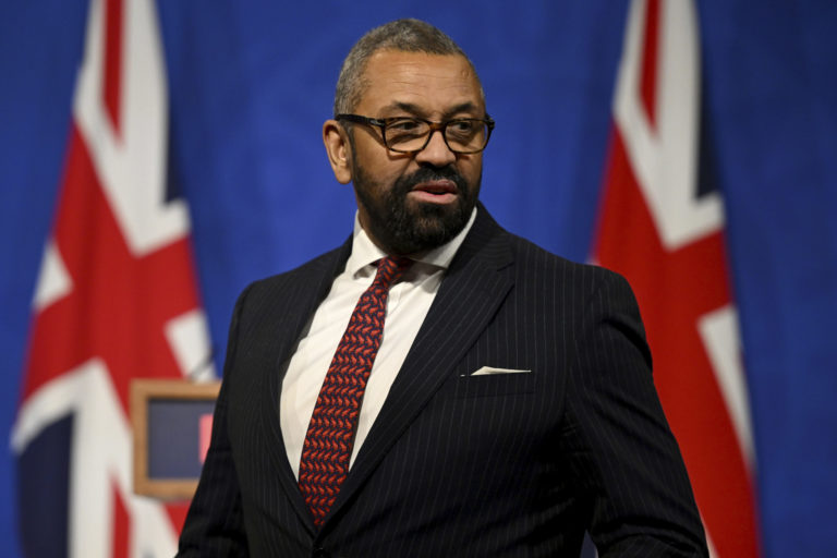 Britský štátny tajomník ministerstva vnútra James Cleverly prichádza na tlačovú konferenciu po rozsudku Najvyššieho súdu o politike Rwandy. Foto: Leon Neal, Pool Photo via AP