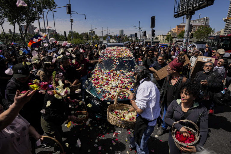 Ľudia hádžu okvetné lístky na pohrebný voz s pozostatkami britsko-čílskej tanečnice a aktivistky za ľudské práva Joan Jaraovej. Foto: SITA/AP