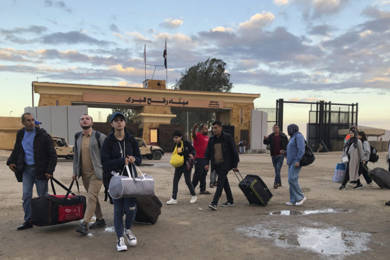 Palestínčania s európskymi pasmi, ktorí boli evakuovaní z Gazy, prechádzajú cez hraničný priechod Rafah v Egypte. Foto: SITA/AP