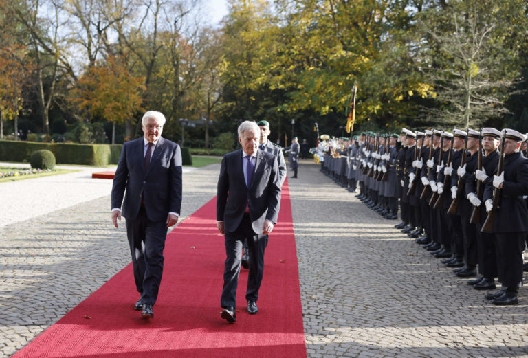 Nemecký prezident Frank-Walter Steinmeier (vľavo) víta fínskeho prezidenta Sauliho Niinista (vpravo) s vojenskými poctami na stretnutí v Bonne. Foto: Thomas Banneyer/dpa via AP