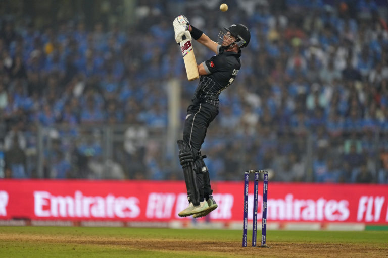 Novozélandský hráč Mitch Santner počas prvého semifinálového zápasu majstrovstiev sveta v krikete mužov medzi Indiou a Novým Zélandom. Foto: SITA/AP