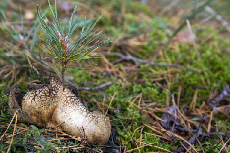 Huba pestrec obyčajný (lat. Scleroderma citrinum), z ktorej vyrastá mladá borovica (lat. Pinus) v lese v Chránenej krajinnej oblasti (CHKO) Záhorie. Lakšárska Nová Ves, 19. október 2019. Foto: SITA/Andrea Mezeiová