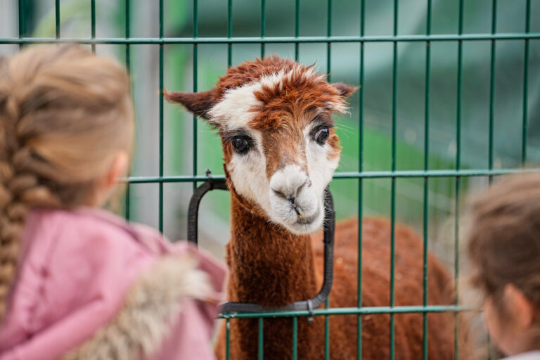Alpaka pozoruje deti cez plot na farme v Castrop-Rauxel. Nemecko, 15. októbra 2025. Foto: (AP Photo/Martin Meissner)