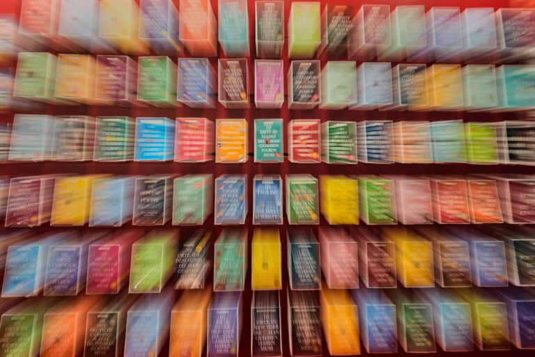 Na obrázku zhotovenom objektívom so zoomom a dlhou rýchlosťou uzávierky je polička na knihy zachytená počas prvého mediálneho dňa knižného veľtrhu vo Frankfurte. Nemecko, 15. októbra 2025. Foto: (AP Photo/Michael Probst)