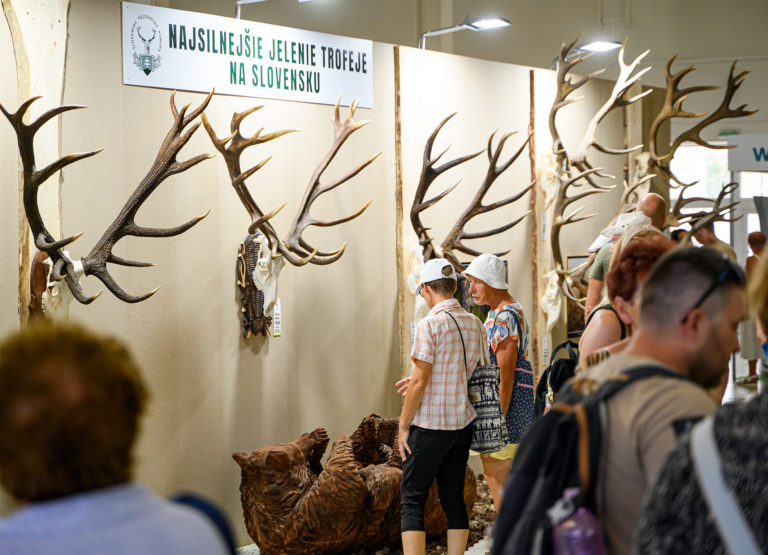 Návštevníci obdivujú parožie počas 13. ročníka výstavy Poľovníctvo, Rybárstvo a Včelárstvo prebiehajúcej súbežne so 49. ročníkom medzinárodnej poľnohospodárskej a potravinárskej výstavy od 15. - 18. augusta 2024 na výstavisku Agrokomplex v Nitre. Nitra, 16. august 2024. Foto: SITA/Martin Havran