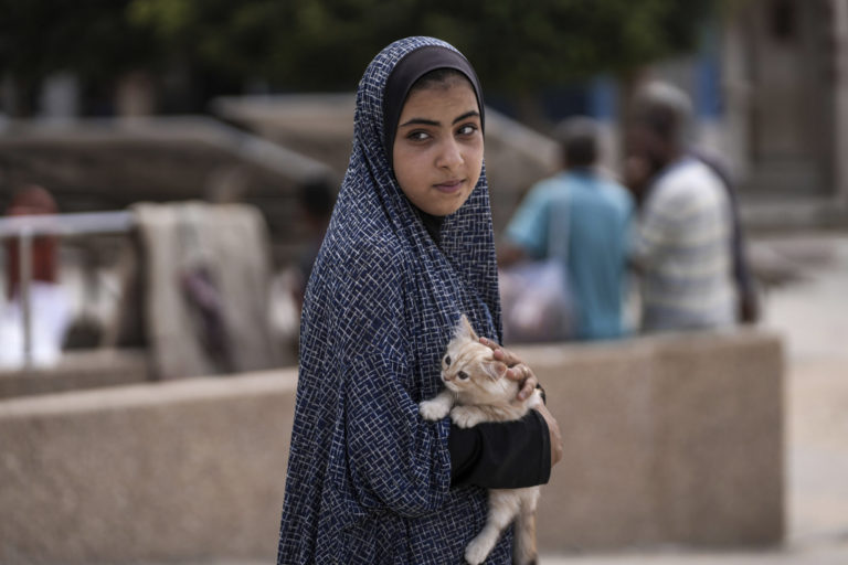 Palestínske dievča opúšťa školu s mačkou v náručí po tom, čo boli civilisti vo východnej časti Deir al-Balah v pásme Gazy izraelskou armádou vyzvaní na evakuáciu z oblasti. 16. august 2024. Foto: SITA/AP