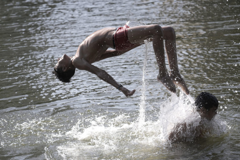 Egyptskí mladíci si užívajú horúci deň v rieke Níl. Káhira, 16. august 2024. Foto: SITA/AP