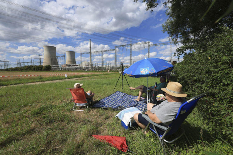 Ľudia piknikujú pred odpálením chladiacich veží odstavenej nemeckej jadrovej elektrárne. Grafenrheinfeld, 16. august 2024. Foto: Karl-Josef Hildenbrand/dpa via AP