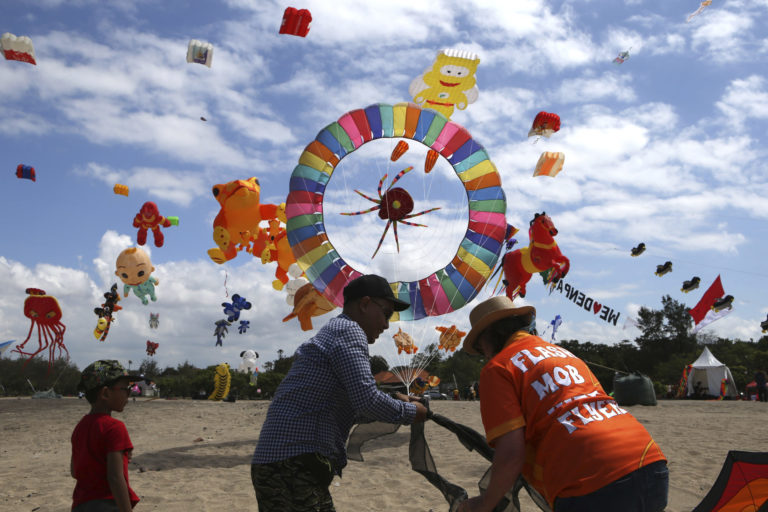Účastníci festivalu šarkanov na indonézskom ostrove Bali pripravujú svojho šarkana na vypustenie. Denpasar, 16. august 2024. Foto: SITA/AP