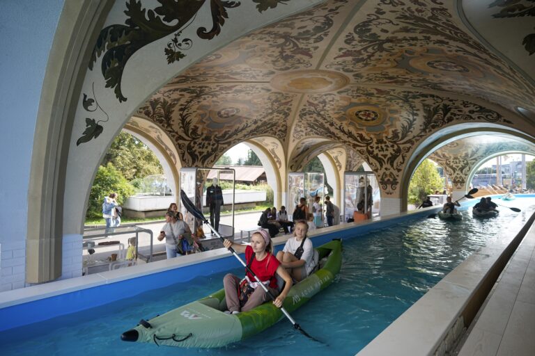 Žena pádluje na kajaku pri kópii Komory Romanovských bojarov inštalovanej v parku Muzeon v Moskve. 16. august 2024. Foto: SITA/AP