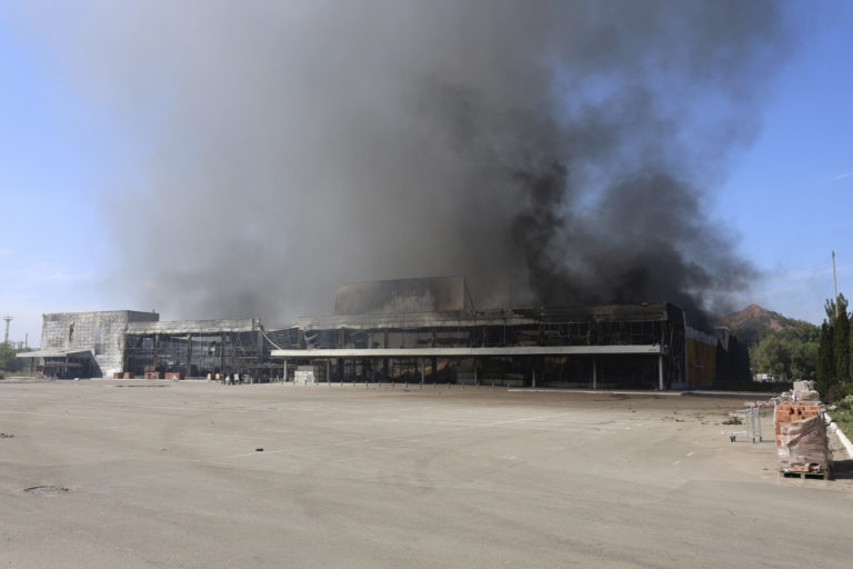 Stúpajúci dym z ostreľovaním zničeného nákupného centra na východe Ukrajiny. Doneck, 16. august 2024. Foto: SITA/AP