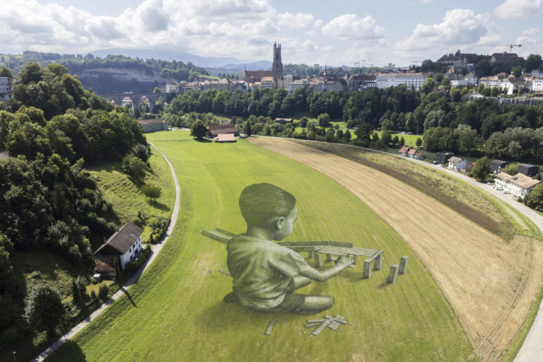 Obrovský biodegradovateľný obraz na poli vo Švajčiarsku od umelca známeho pod menom Saype. Fribourg, 16. august 2024. Foto: Cyril Zingaro/Keystone via AP