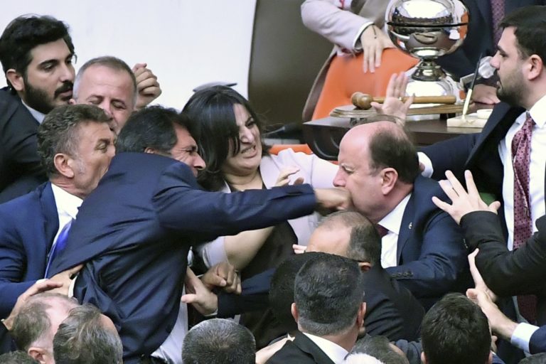 Bitka medzi poslancami vládnej strany AKP a opozičnými poslancami v tureckom parlamente. Ankara, 16. august 2024. Foto: DIA Images via AP
