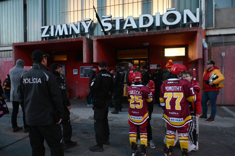 Policajti a fanúšikovia HK Dukla Trenčín opúšťajú Zimným štadión Pavla Demitru v Trenčíne pred začiatkom hokejového zápasu 44. kola Tipos extraligy 2023/2024 medzi HK Dukla Trenčín - HK Dukla Ingema MIchalovce, ktorý z dôvodu úniku čpavku musel byť zrušený. Trenčín, 16. február 2024. Foto: SITA/Tomáš Somr