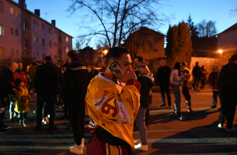 Hráč HK Dukla Jozef Baláž telefonuje pred Zimným štadiónom Pavla Demitru v Trenčíne pred začiatkom hokejového zápasu 44. kola Tipos extraligy 2023/2024 medzi HK Dukla Trenčín - HK Dukla Ingema MIchalovce, ktorý z dôvodu úniku čpavku musel byť zrušený. Trenčín, 16. február 2024. Foto: SITA/Tomáš Somr