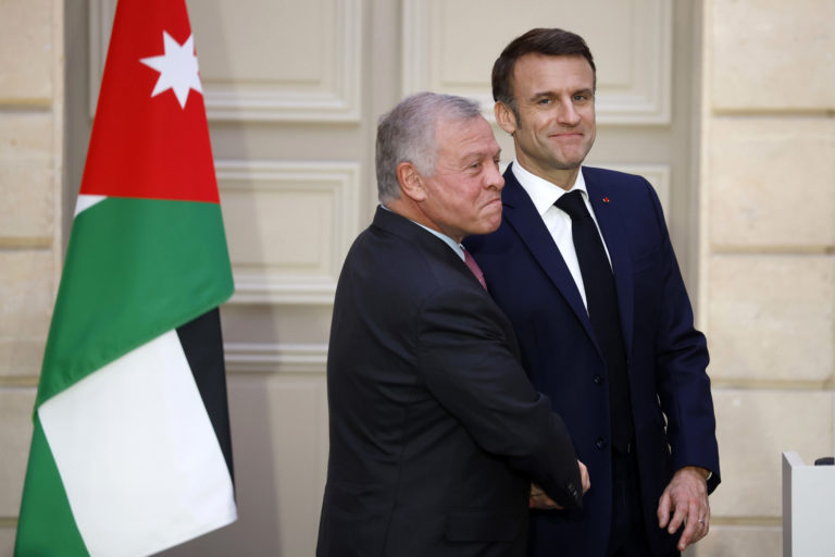 Jordánsky kráľ Abdullah II sa stretol s francúzskym prezidentom Emmanuelom Macronom po tom, čo vyzval Bidena, aby presadzoval prímerie v Gaze. Foto: SITA/AP