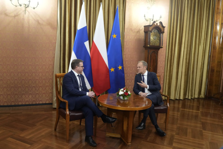 Poľský premiér Donald Tusk (vpravo) sedí s fínskym premiérom Petteri Orpom počas ich stretnutia v kancelárii poľského premiéra vo Varšave. Foto: SITA/AP