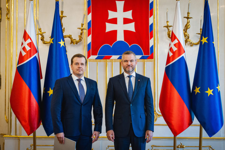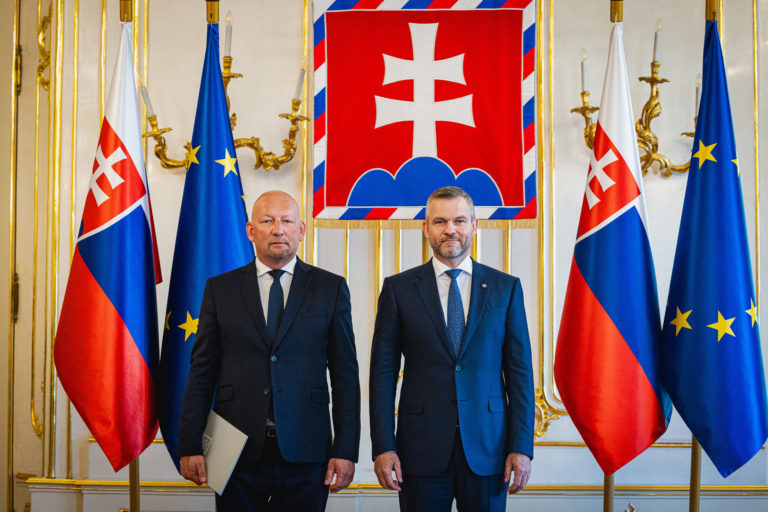 Zľava: Nový člen Súdnej rady Martin Puchalla a prezident SR Peter Pellegrini počas vymenovania troch nových členov Súdnej rady prezidentom SR v Prezidentskom paláci. Bratislava, 16. júl 2024. Foto: SITA/Kancelária prezidenta SR