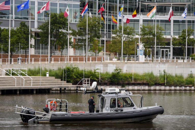 Policajná loď hliadkuje na rieke Milwaukee počas druhého dňa Národného republikánskeho zjazdu Foto: SITA/AP