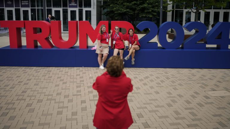 Skupina dobrovoľníkov pózuje pred Fiserv Forum počas druhého dňa Národného zjazdu republikánov. Foto: SITA/AP