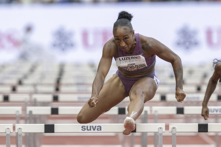 Jasmine Camacho-Quinnová z Portorika počas behu žien na 100 m cez prekážky na Medzinárodnom atletickom mítingu. Foto: Urs Flueeler/Keystone via AP