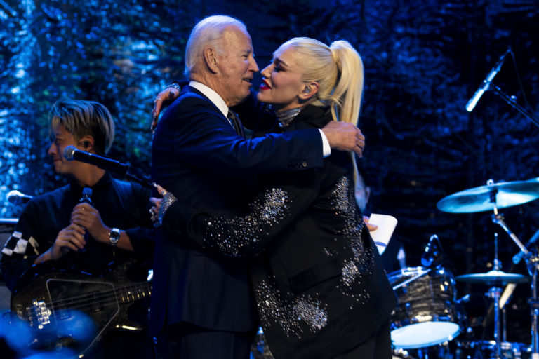 Americký prezident Joe Biden objíma speváčku Gwen Stefani po tom, čo vystúpila na uvítacej recepcii samitu APEC. Foto: Doug Mills/The New York Times via AP, Pool.