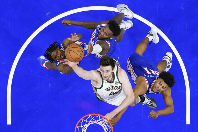 Basketbalista Boston Celtics' Luke Kornet (uprostred) sa snaží dať kôš v druhom polčase zápasu proti Philadelphii. Foto: SITA/AP.
