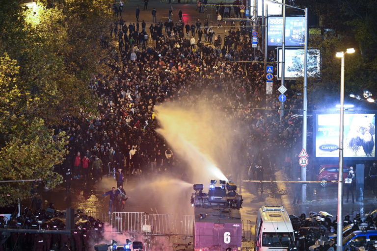 Maďarské bezpečnostné zložky museli použiť vodné delo počas stretov s bulharskými fanúšikmi pred kvalifikačným futbalovým zápasom G-skupiny UEFA Euro 2024 medzi Bulharskom a Maďarskom. Foto: Zsolt Szigetvary/MTI via AP.