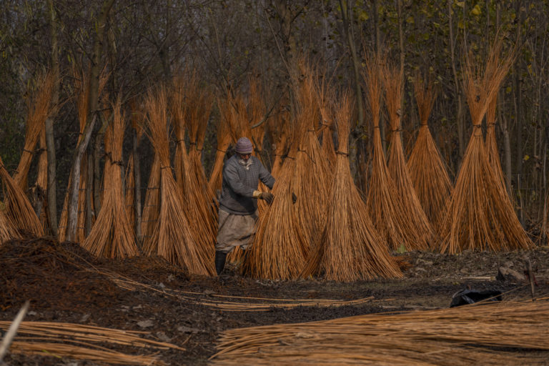 Kašmírsky dedinčan kontroluje prútené palice, ktoré zostali na sušenie na predmestí Srinagaru. Prútie sa používa na výrobu tradičných hrncov na oheň nazývaných kangri. Foto: SITA/AP.