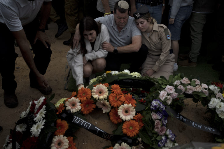Naama Doplet (vľavo) smúti počas pohrebu izraelského armádneho kapitána Kfira Franca, ktorý zahynul počas bojov v pásme Gazy. Foto: SITA/AP.
