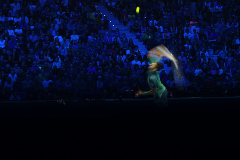 Srbský tenista Novak Djokovič podáva loptičku Poliakovi Hubertovi Hurkaczovi počas ich dvojhry na tenisovom turnaji ATP World Tour Finals v talianskom Turíne. Foto: SITA/AP.