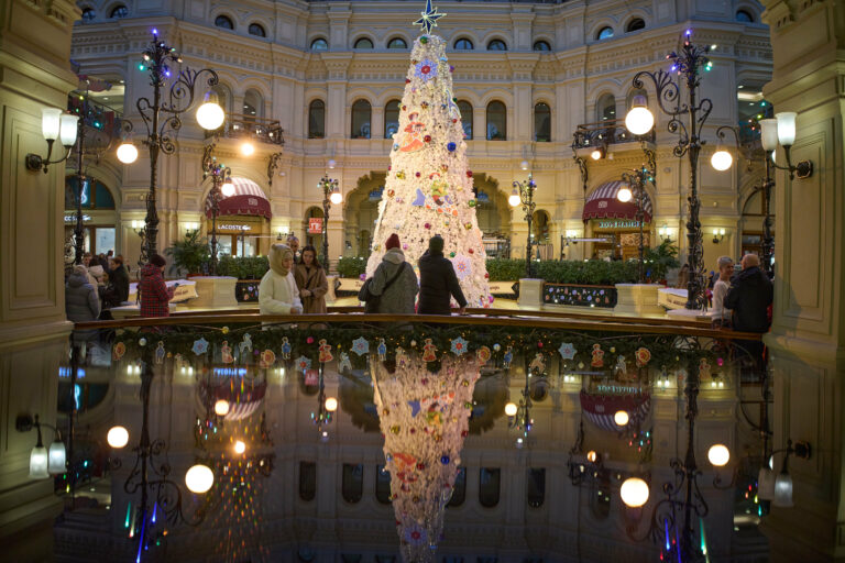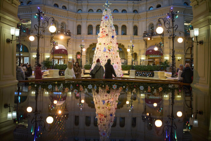 Návštevníci prechádzajú obchodným domom GUM vyzdobeným na Vianoce a novoročné oslavy v Moskve. Rusko, 16. novembra 2025. AP Photo/Alexander Zemlianichenko